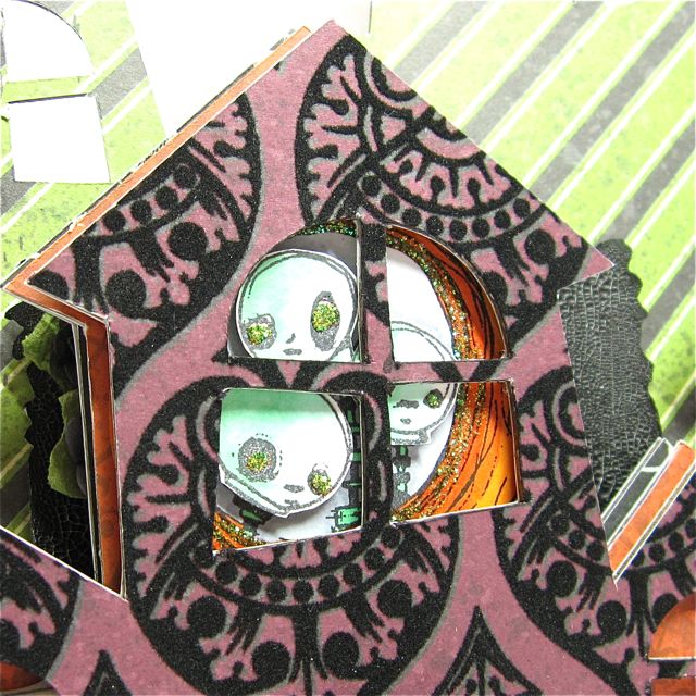 Hahaha! I had a grand old time putting this project together. I used the haunted house chipboard book by Magenta and papered it with all sorts of fabulous designs by Reflections. I was a little intimidated at first, because this is not my usual type of task. I'm a card maker and that's where my comfort zone resides most of the time...a nice, warm, safe environment for it to dwell. This, however, was as simple as covering the chipboard with glue stick, slapping the paper on it, and then trimming it out with a craft knife. After I papered the back and front of each of the 4 pages, then the fun really started! I played with a whole cast of the Stampotique Characters. They just seemed to belong in this slightly off-kilter setting.